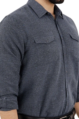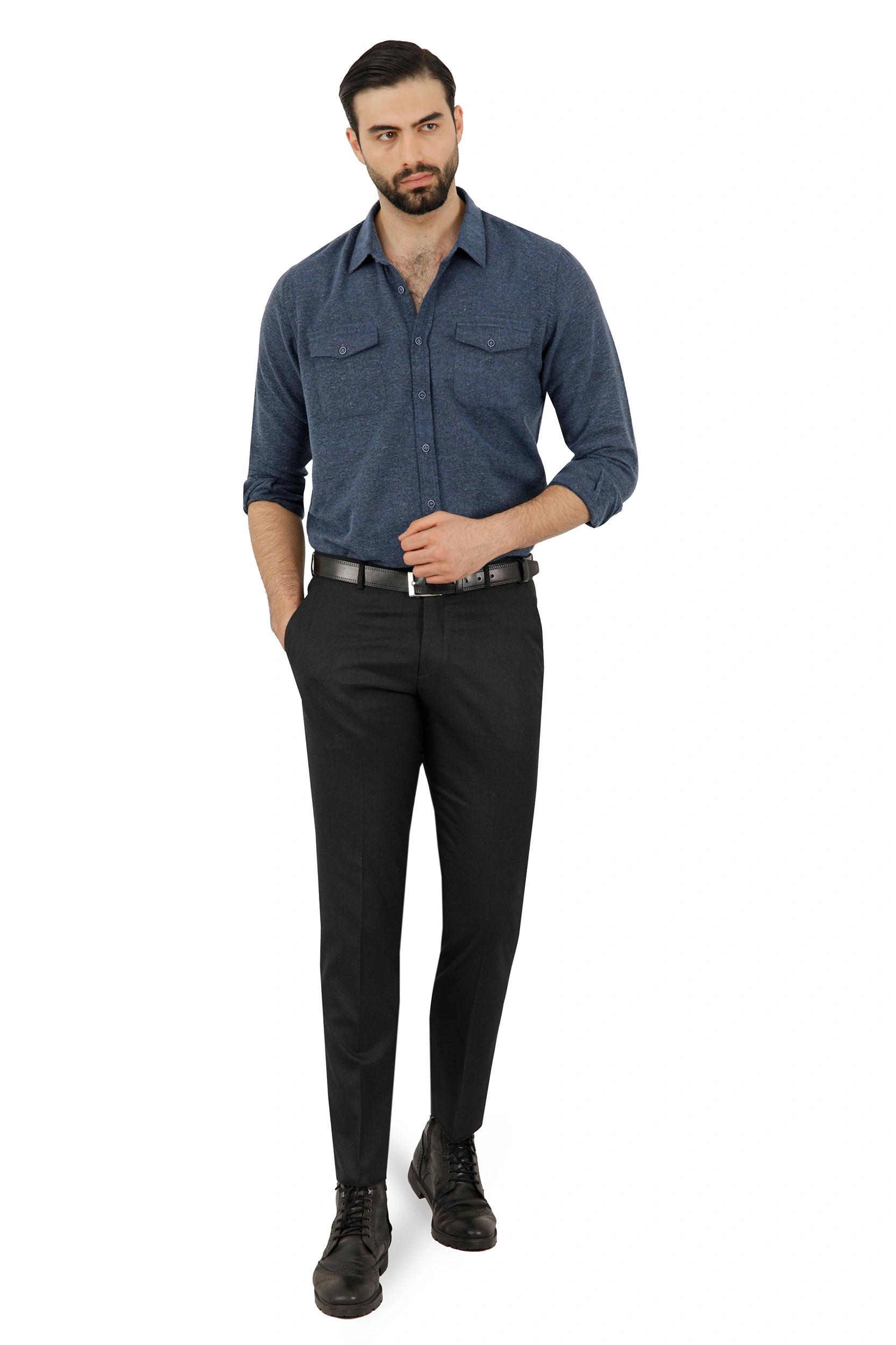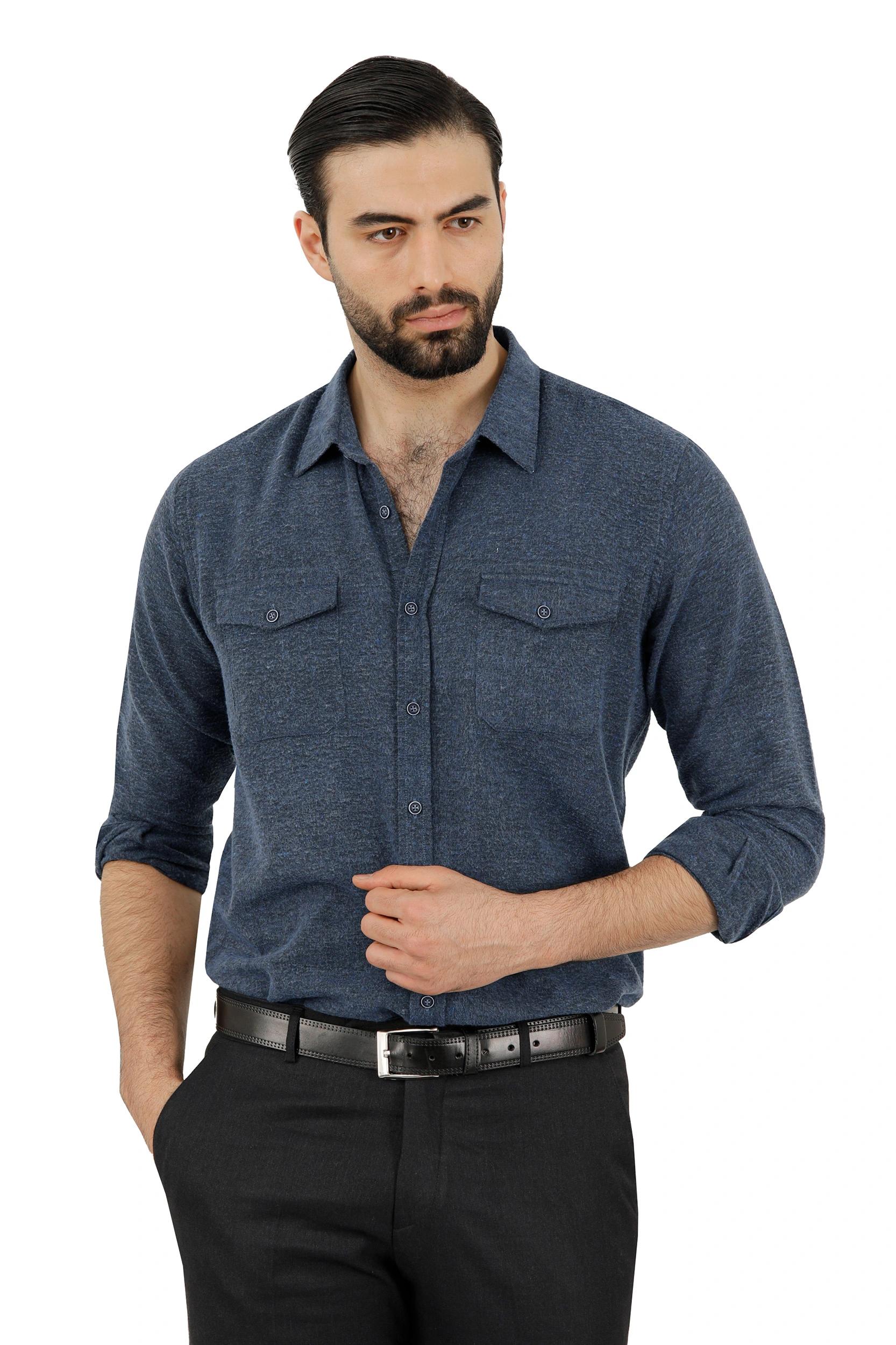 خرید پیراهن پشمی مردانه ، جنس پیراهن 65 درصد پلی استر - 35 درصد پنبه می باشد. زیر دست لطیف و نسبتاً گرم دارد ، پیراهن دو جیب در دار حالت کرکی، قواره معمولی (رگولار). یقه برگردان.