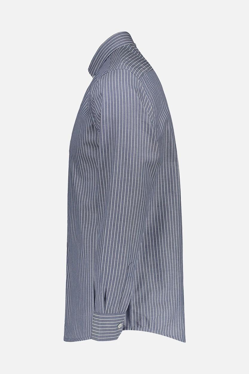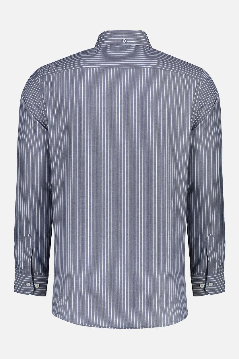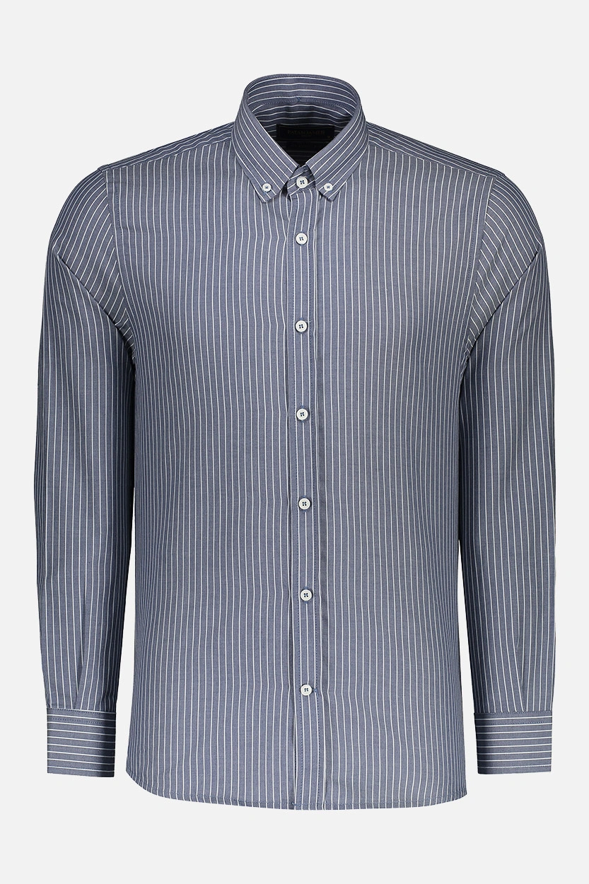 پیراهن طوسی سیر راهراه سفید: بهترین انتخاب برای ست با شلوار پارچهای مشکی یا طوسی روشن، همراه با کفش چرمی مشکی.