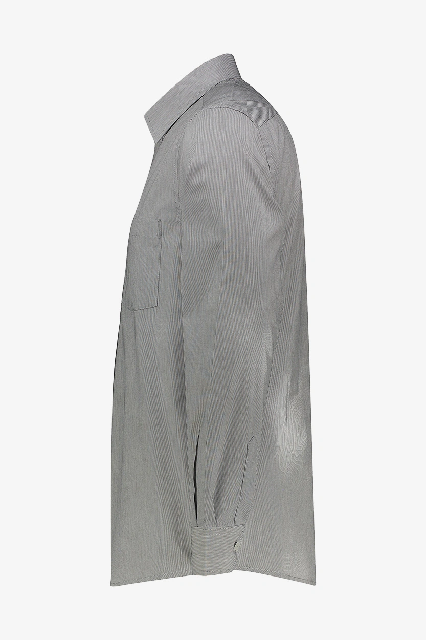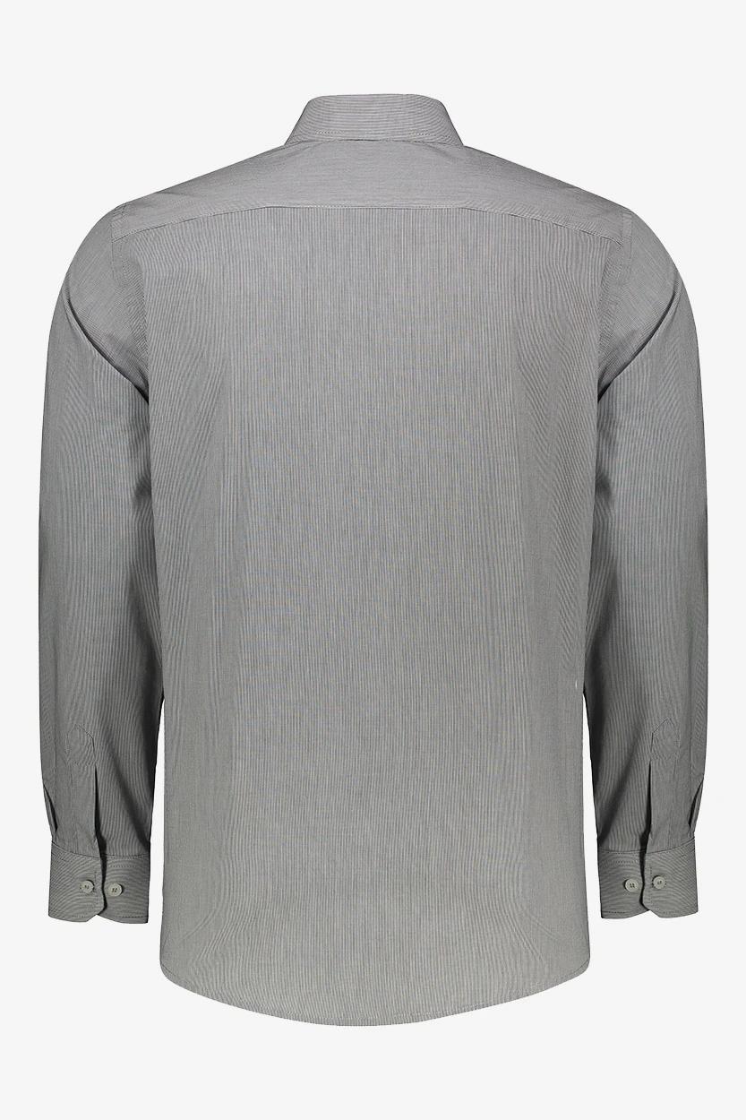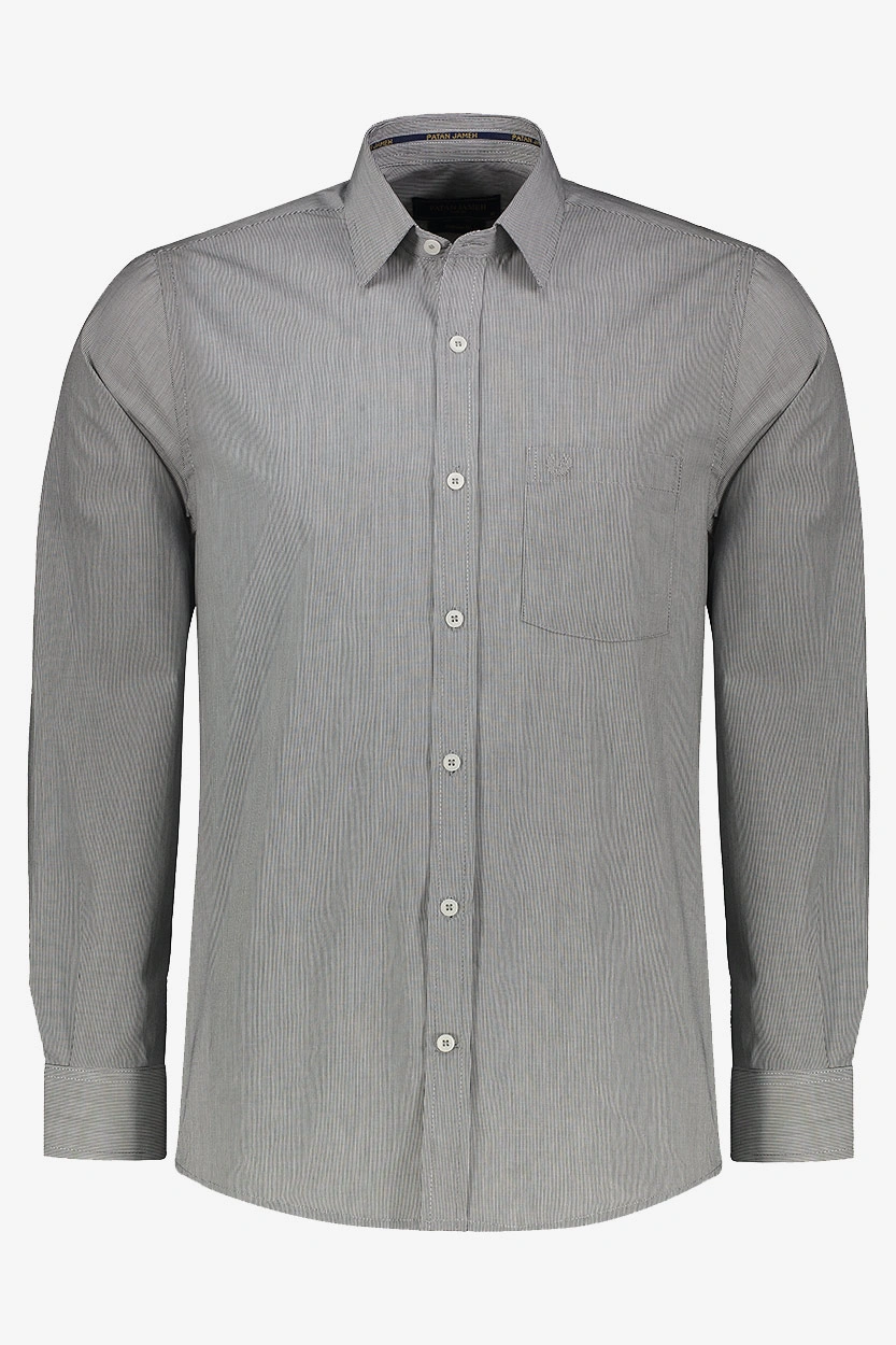 برای یک ظاهر رسمی و مرتب، پیراهن راهراه طوسی یا آبی تیره را با شلوار پارچهای مشکی یا سرمهای و کفش چرمی قهوهای ست کنید. این ترکیب برای محیط کار یا جلسات رسمی انتخابی بینقص است.