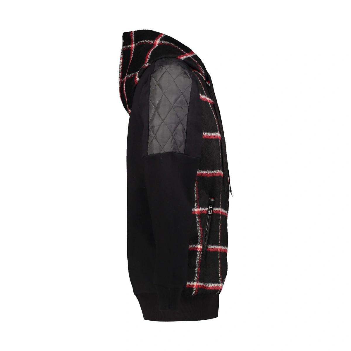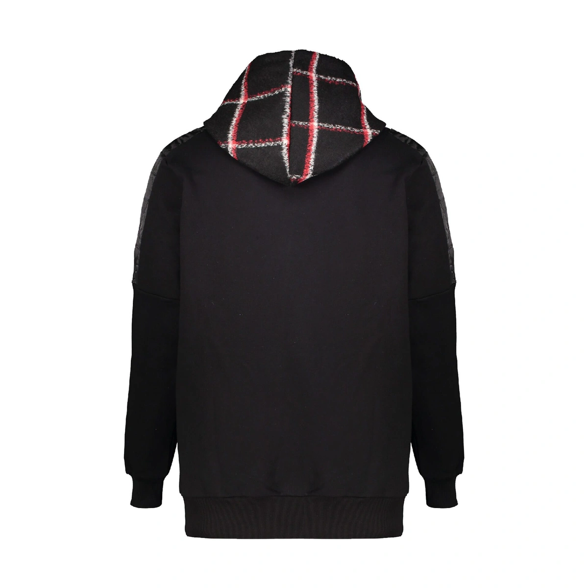سویشرت مشکی کلاهدار مردانه صد در صد پنبه می باشد. قسمت جلو و کلاه پشمی (کرکی) و روی شانه ها از پارچه شمعی استفاده شده است. جلو زیپدار به همراه دو جیب جانبی زیپدار می باشد. قد سویشرت تا زیر کمر می باشد. سویشرت قواره دار می باشد لذا جهت اطلاع از اندازه دقیق