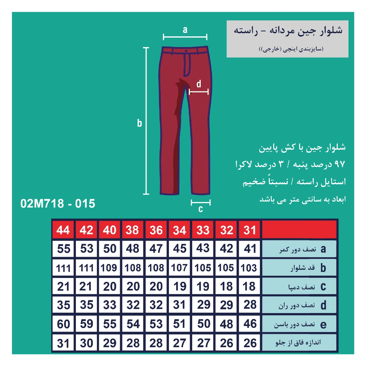 شلوار جین مردانه راسته , جین با ضخامت متوسط و کش پایین استایل راسته می باشد. 97 درصد پنبه و 3 درصد لاکرا (کش).