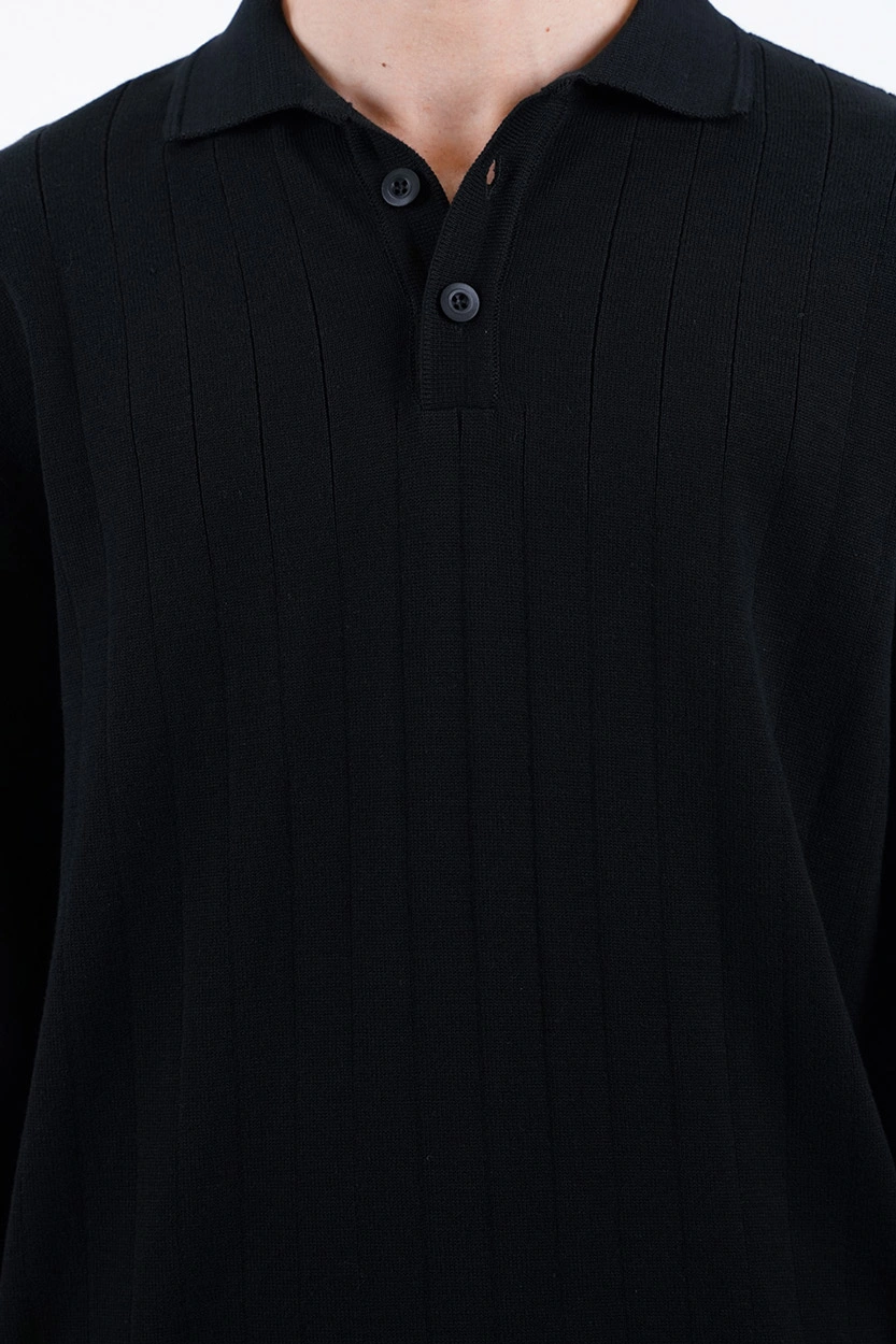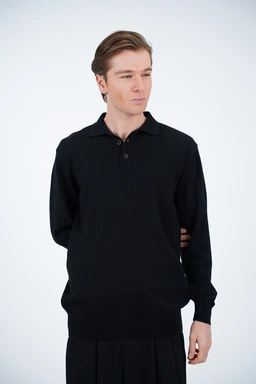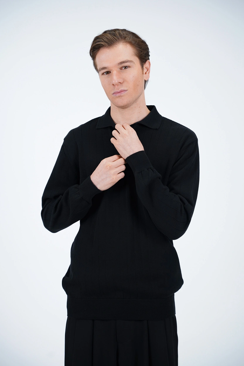 بافت مردانه سه‌دکمه با یقه‌برگردان کلاسیک، یکی از مدل‌هایی است که هیچ‌گاه از مد نمی‌افتد. طراحی دکمه‌دار در قسمت یقه علاوه بر جنبه تزئینی، این امکان را می‌دهد که استایل لباس را بسته به موقعیت تغییر دهید. می‌توانید با باز گذاشتن دکمه‌ها ظاهری اسپرت و روزمره داشته باشید یا با بستن آن‌ها استایلی رسمی‌تر و مرتب‌تر بسازید. فرم یقه‌برگردان نیز جلوه‌ای مردانه و منظم به لباس می‌دهد که برای هر سنی مناسب است.