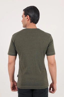 پارچه این تیشرت ترکیبی از پنبه و لاکرا است؛ یعنی در کنار لطافت و خاصیت تنفسی پنبه، کمی کشسانی نیز دارد که باعث راحتی بیشتر در حرکت میشود. ضخامت کم پارچه آن را به گزینهای خنک و سبک برای فصول گرم تبدیل کرده است. یقه گرد کشبافت تیشرت بهخوبی روی فرم گردن قرار میگیرد و ظاهر ساده آن را کامل میکند.