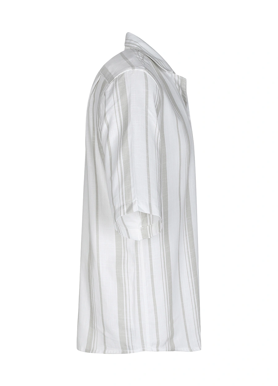 پیراهن یقه انگلیسی مردانه آستین کوتاه، انتخابی ساده، خنک و خوشفرم برای آقایانی است که در عین توجه به راحتی، به استایل کلاسیک و مرتب اهمیت میدهند. ترکیب پارچه نخی با طراحی دقیق و سه رنگبندی راهراه جذاب، این پیراهن را به همراهی ایدهآل در روزهای گرم سال تبدیل کرده است.