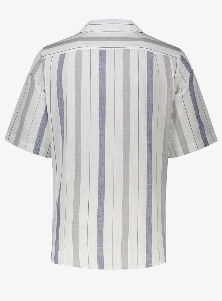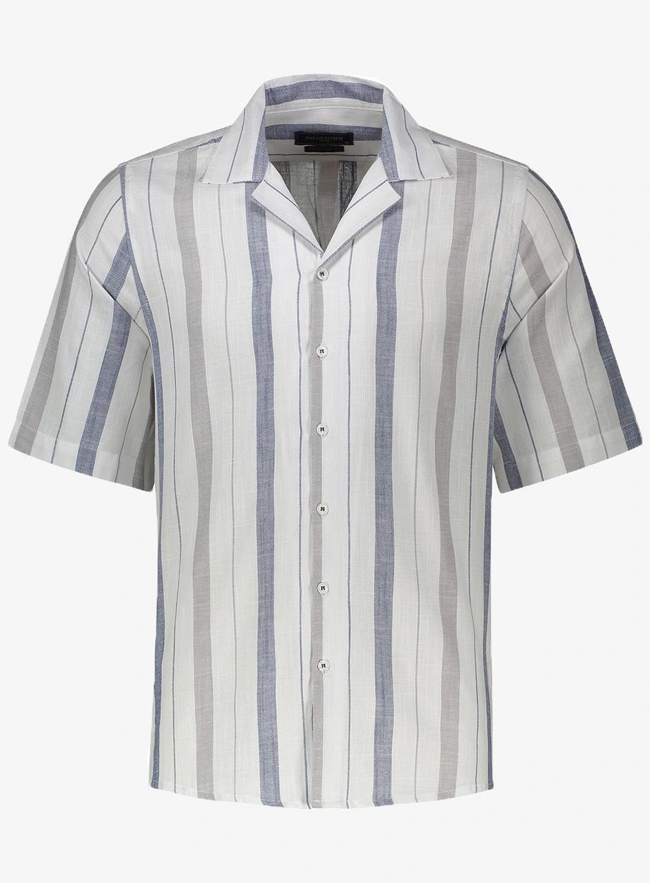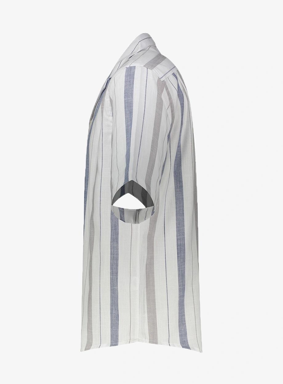 راهراه سفید – آبی – طوسی: مناسب برای موقعیتهای نیمهرسمی و کاری، قابل ترکیب با جین تیره یا کتان طوسی.