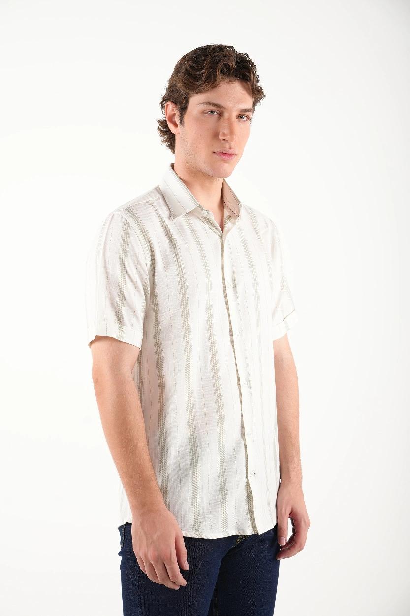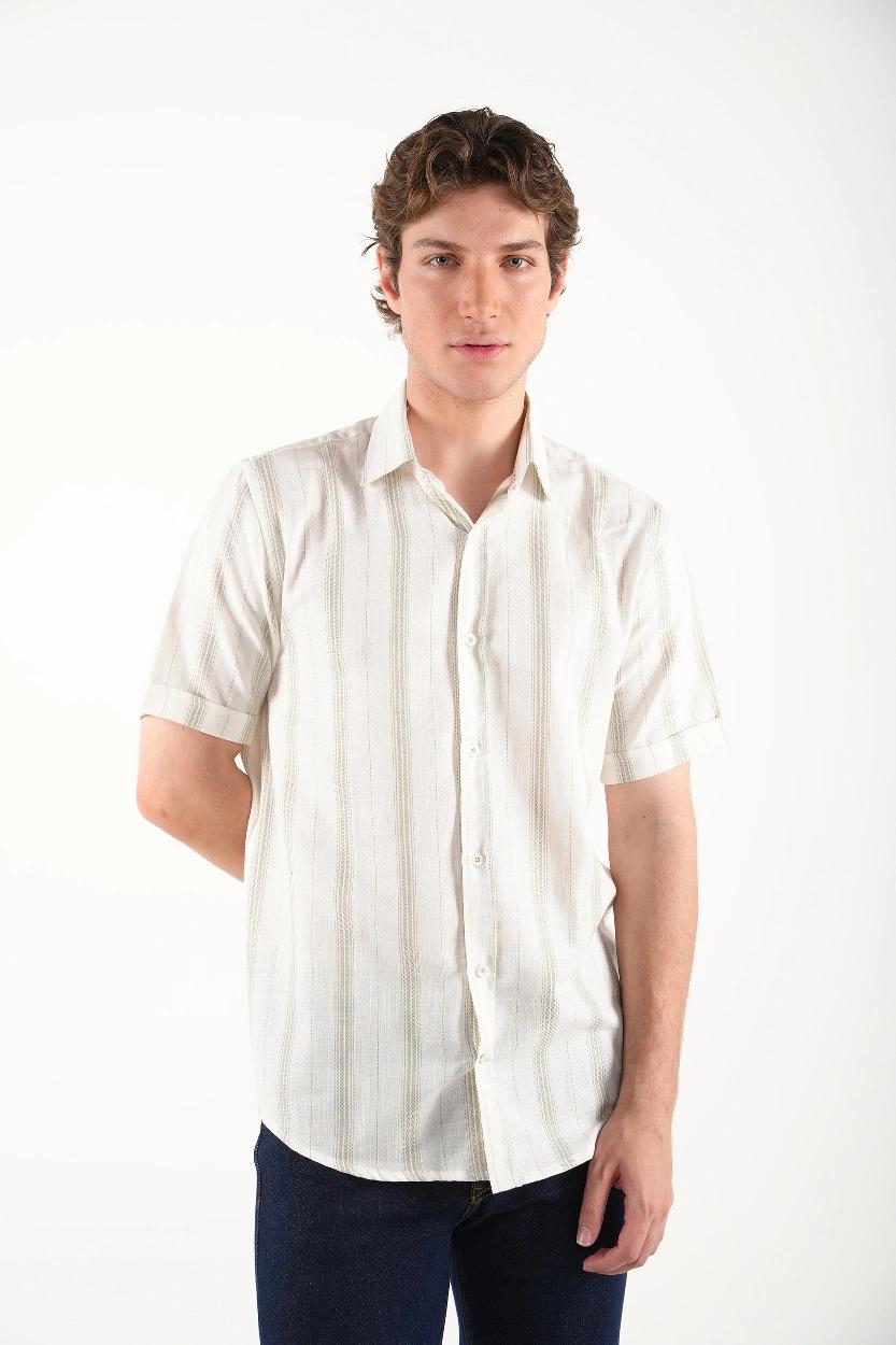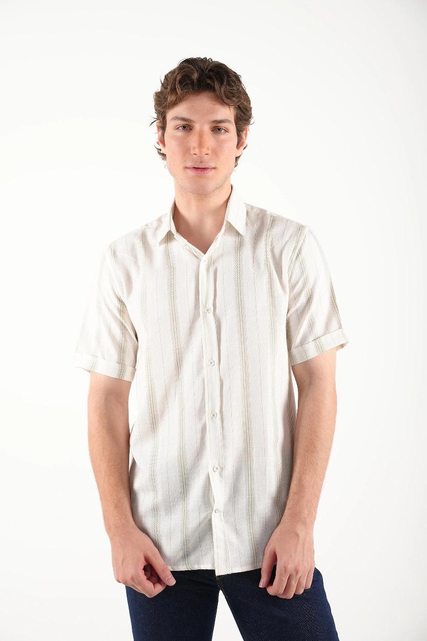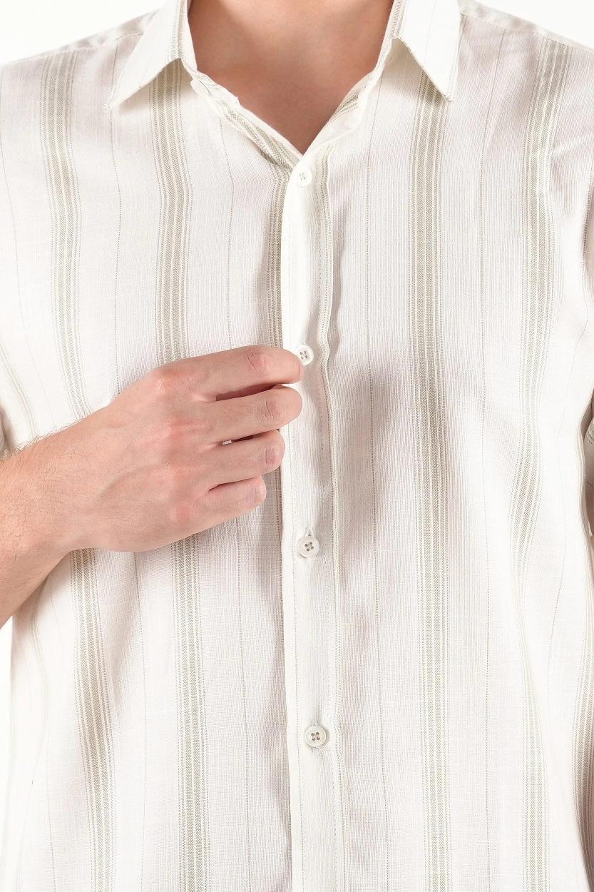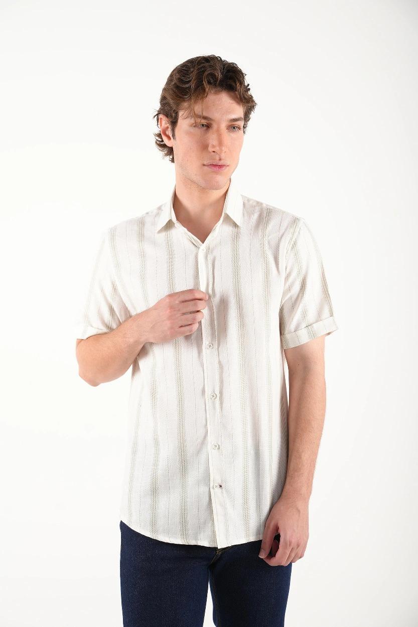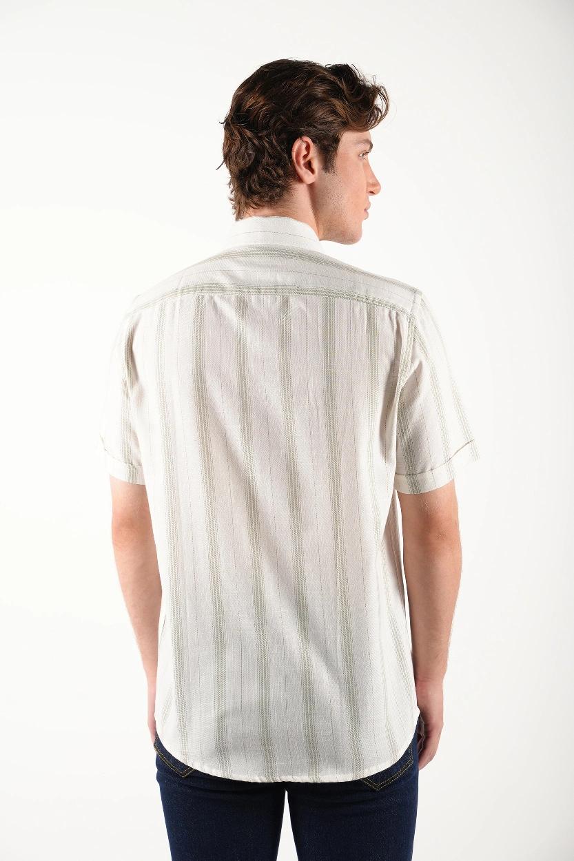 استایل کلاسیک: پیراهن راهراه شیری – سبز + شلوار پارچهای مشکی + کفش رسمی مشکی.