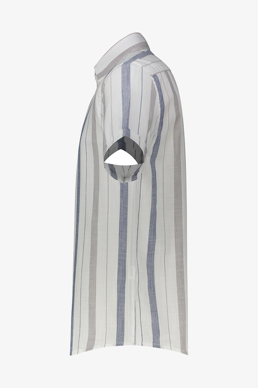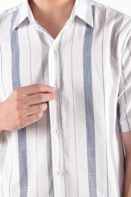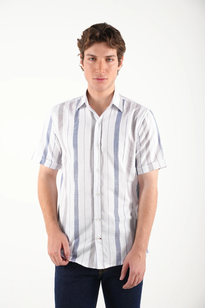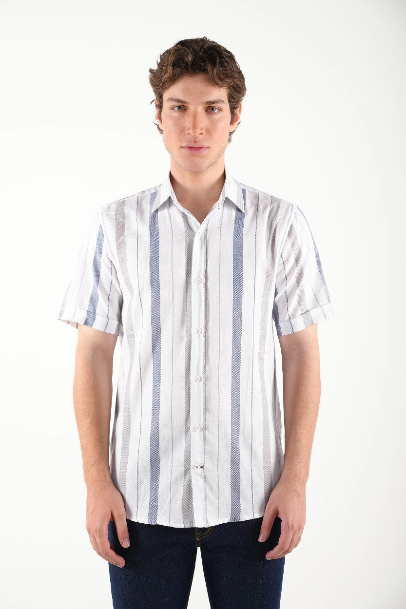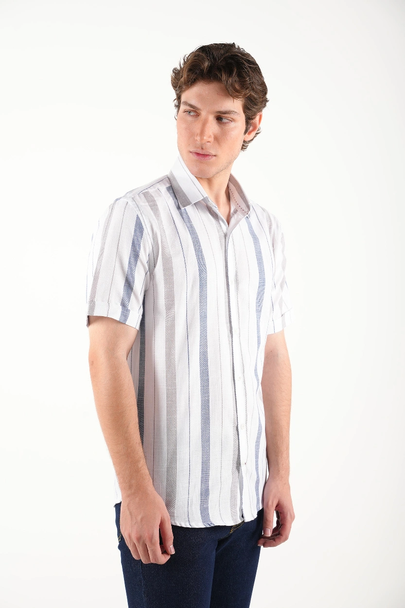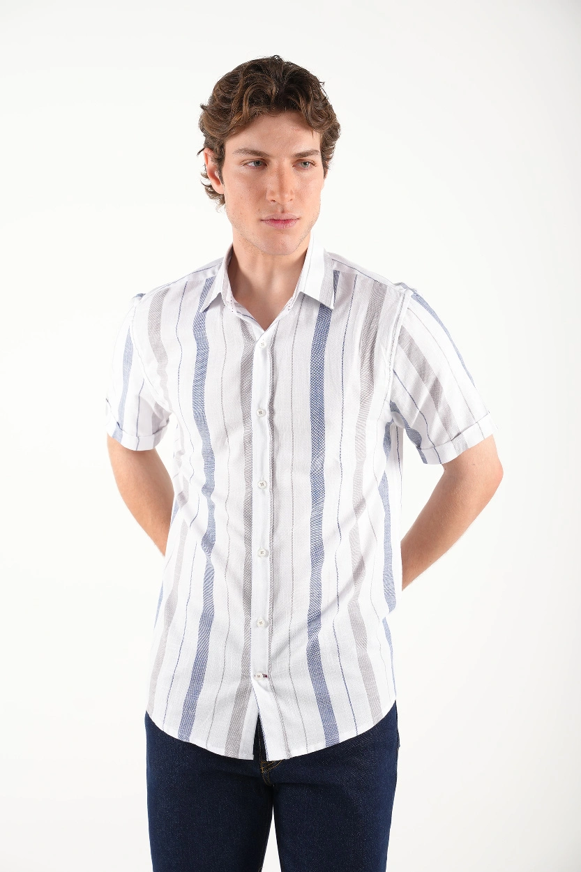 راهراه سفید – آبی : مناسب برای موقعیتهای نیمهرسمی و کاری، قابل ترکیب با جین تیره یا کتان طوسی.