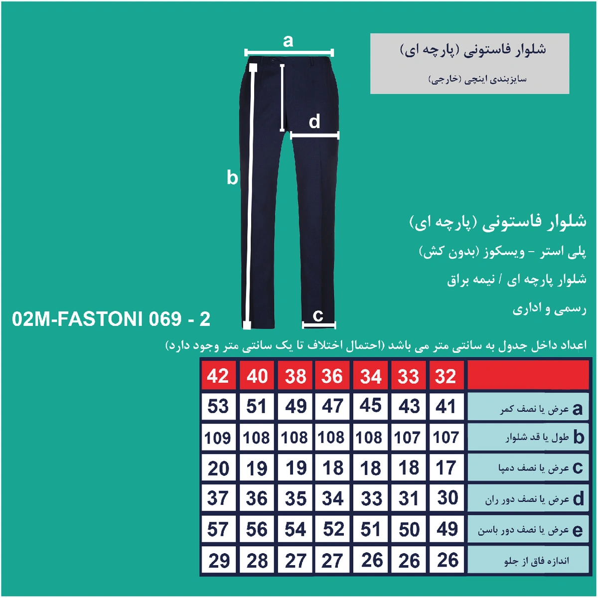 شلوار فاستونی (پارچه ای) مردانه تولید پاتن جامه می باشد. شلوار پارچه ای رسمی جنس پلی استر ویسکوز و پشم می باشد. شلوار استایل راسته دمپا معمولی با فاق متوسط.