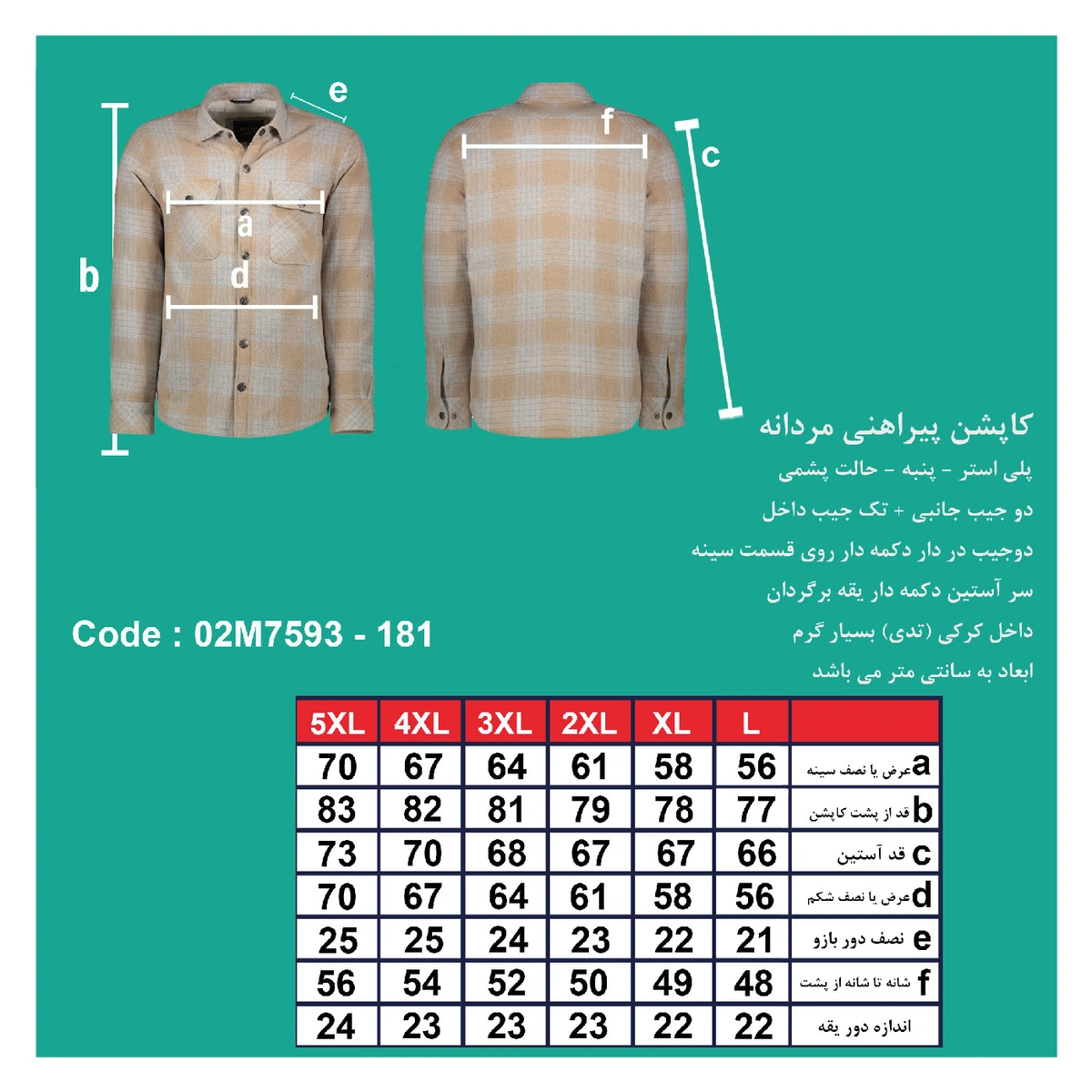 کاپشن پیراهنی مردانه داخل کرکی (تدی). جنس رویه پلی استر - پنبه حالت پشمی دارد. نسبتاً ضخیم داخل آستری کرکی بسیار گرم می باشد. قد تاروی باسن.