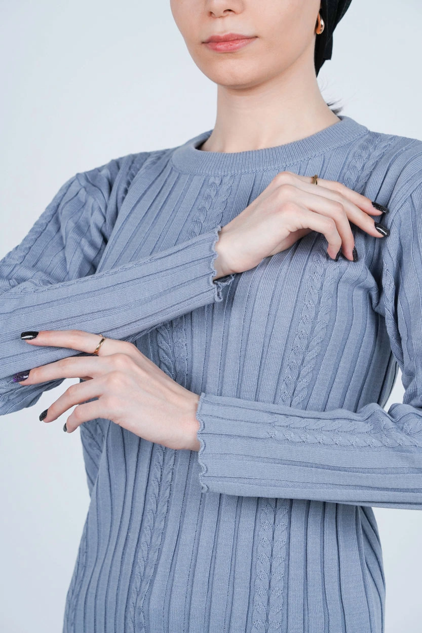 • استایل خاص: بافت آبی را با دامن بلند و بوت بلند امتحان کنید تا استایلی متفاوت و زنانه خلق کنید.