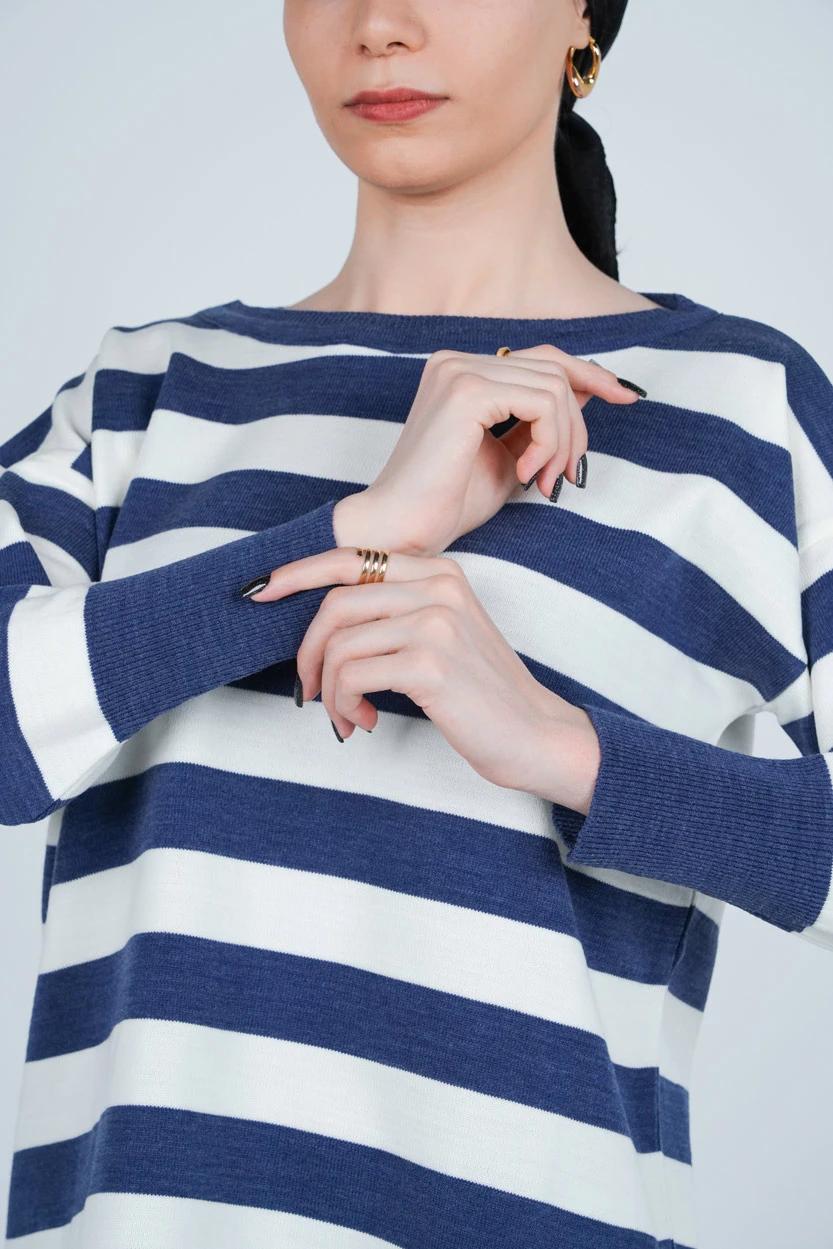 طرح راه‌راه از جمله الگوهای محبوب در دنیای مد است که به‌خوبی می‌تواند تناسب اندام را نمایش دهد. راه‌راه‌های افقی این مدل، باعث می‌شوند لباس ظاهری زنده و پرانرژی پیدا کند. یقه گرد ساده در ترکیب با آستین بلند، ظاهری مینیمال و شیک می‌سازد که برای استایل‌های روزمره، کاری و حتی دورهمی‌های دوستانه مناسب است. قواره معمولی این بافت نیز باعث شده تا روی بدن خوش‌فرم بنشیند و آزادی حرکتی لازم را برای استفاده روزانه فراهم کند.