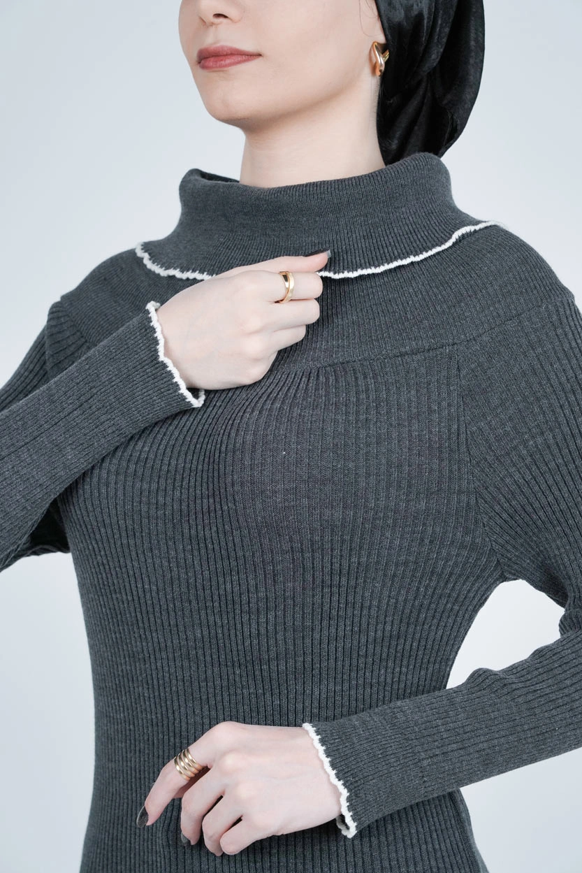 طراحی یقه ایستاده یکی از ویژگی‌های اصلی این بافت است. این نوع یقه با ایجاد ظاهری مرتب و خاص، علاوه بر زیبایی، گرمای بیشتری برای گردن فراهم می‌کند. یقه ایستاده در ترکیب با آستین بلند و قد تا روی باسن باعث می‌شود این لباس به‌خوبی فرم بدن را پوشش دهد و استایلی مرتب، مینیمال و مدرن بسازد. بافت منظم و تراکم مناسب تار و پود لباس، آن را از نظر ظاهری چشم‌نواز و از نظر کاربردی کاملاً مناسب روزهای سرد سال کرده است.