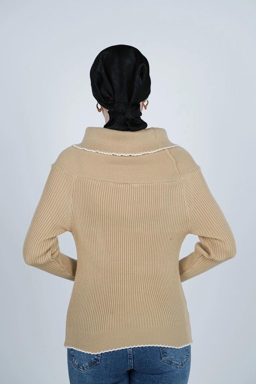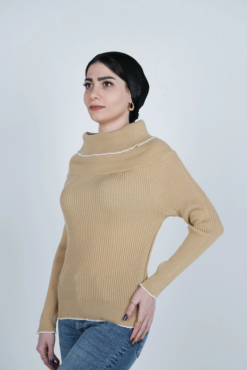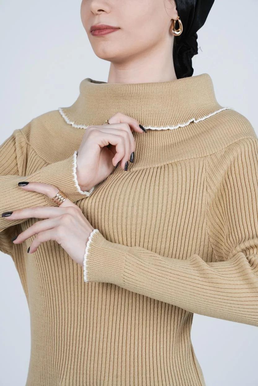 طراحی یقه ایستاده یکی از ویژگی‌های اصلی این بافت است. این نوع یقه با ایجاد ظاهری مرتب و خاص، علاوه بر زیبایی، گرمای بیشتری برای گردن فراهم می‌کند. یقه ایستاده در ترکیب با آستین بلند و قد تا روی باسن باعث می‌شود این لباس به‌خوبی فرم بدن را پوشش دهد و استایلی مرتب، مینیمال و مدرن بسازد. بافت منظم و تراکم مناسب تار و پود لباس، آن را از نظر ظاهری چشم‌نواز و از نظر کاربردی کاملاً مناسب روزهای سرد سال کرده است.