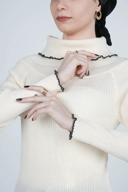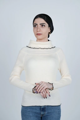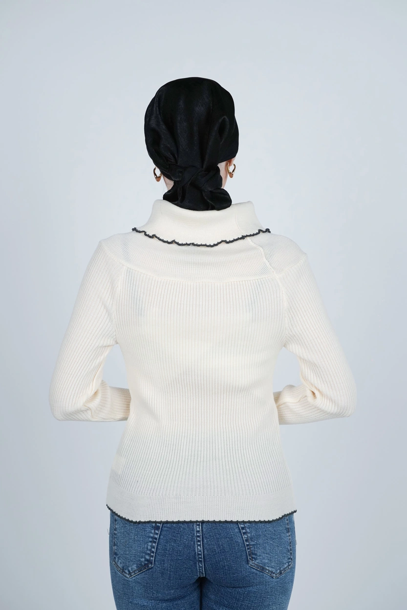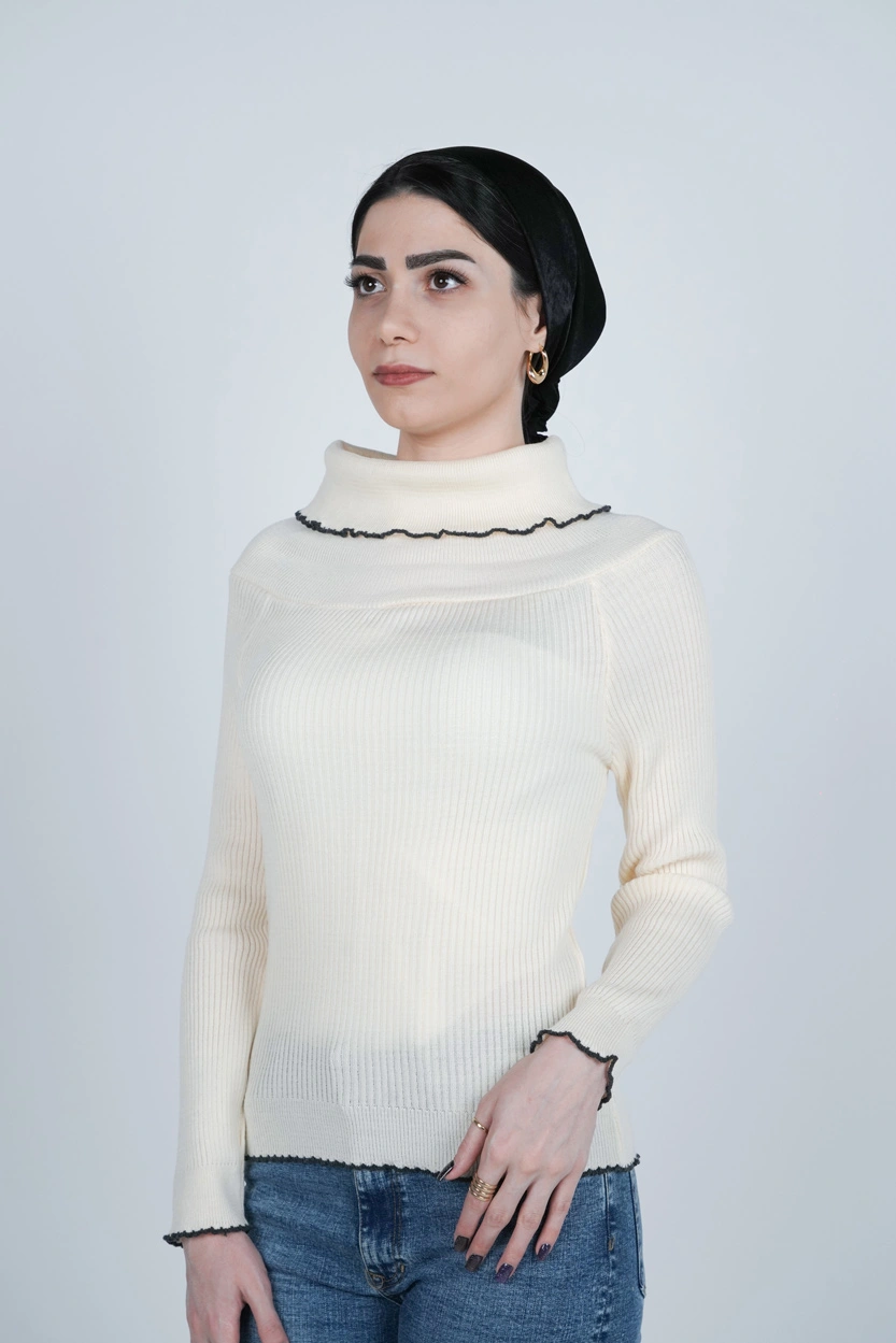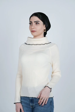طراحی یقه ایستاده یکی از ویژگیهای اصلی این بافت است. این نوع یقه با ایجاد ظاهری مرتب و خاص، علاوه بر زیبایی، گرمای بیشتری برای گردن فراهم میکند. یقه ایستاده در ترکیب با آستین بلند و قد تا روی باسن باعث میشود این لباس بهخوبی فرم بدن را پوشش دهد و استایلی مرتب، مینیمال و مدرن بسازد. بافت منظم و تراکم مناسب تار و پود لباس، آن را از نظر ظاهری چشمنواز و از نظر کاربردی کاملاً مناسب روزهای سرد سال کرده است.