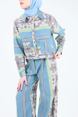 کت این ست در مدل کراپ طراحی شده؛ یعنی قد آن تا روی کمر است و ظاهری جوان، چشمگیر و امروزی ایجاد میکند. یقه برگردان آن جلوهای رسمی و کلاسیک به کت داده و در ترکیب با طرح پارچه کاملاً هماهنگ است. این نوع طراحی برای خانمهایی که استایل خاص و متفاوت میپسندند، انتخابی فوقالعاده است. همچنین کت کراپ به دلیل فرم جذابی که ایجاد میکند، بهخوبی با تیپهای رسمی و نیمهرسمی هماهنگ میشود.