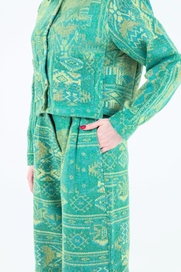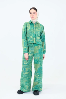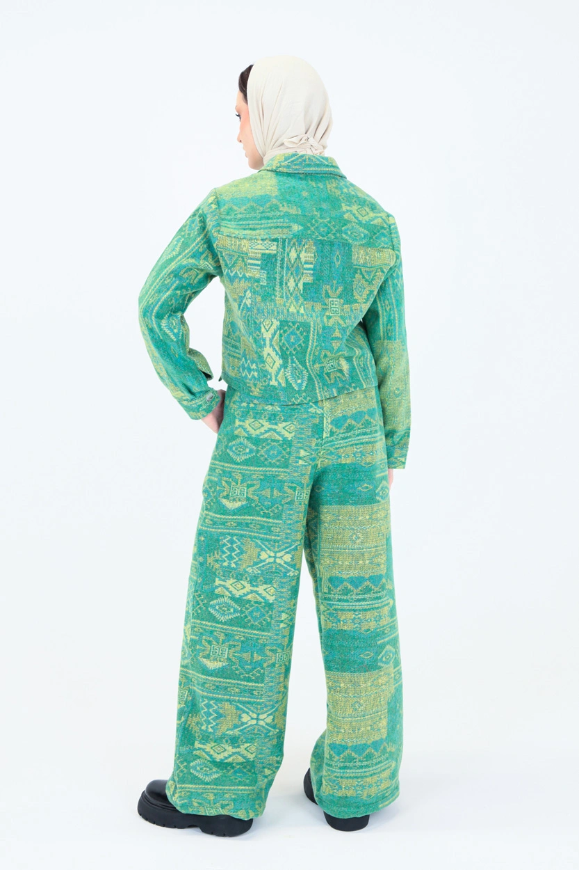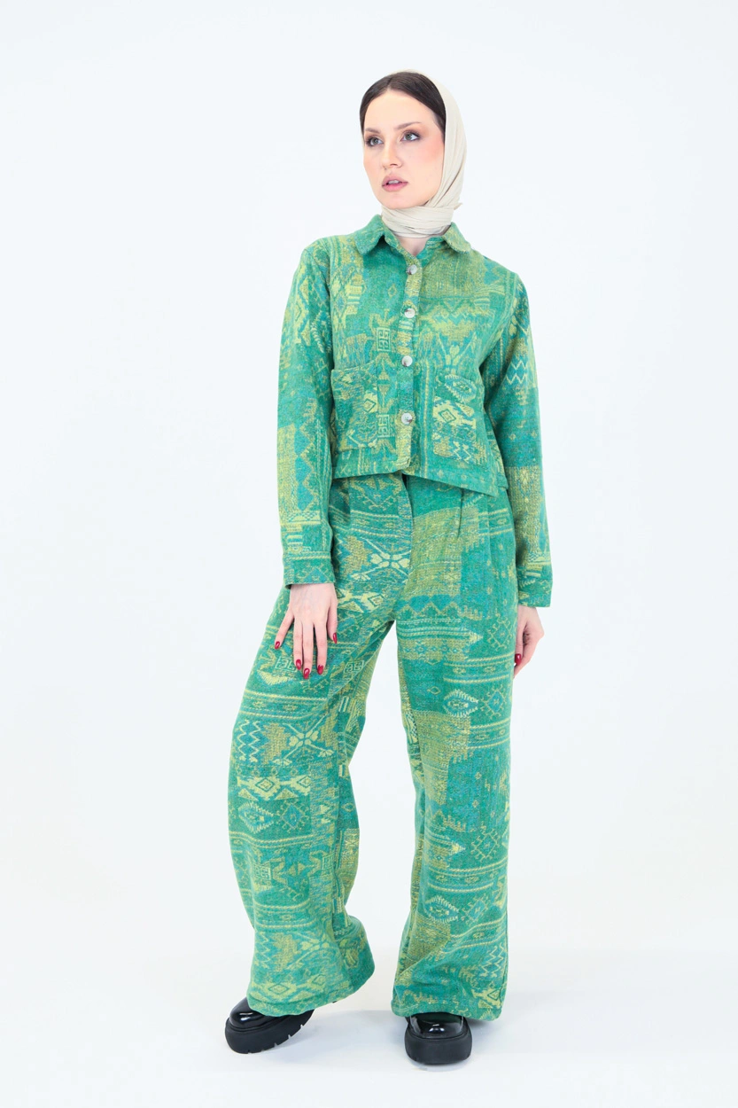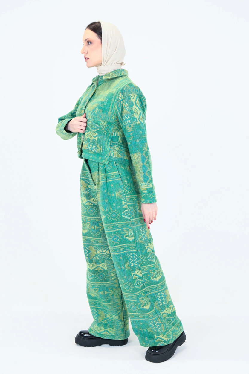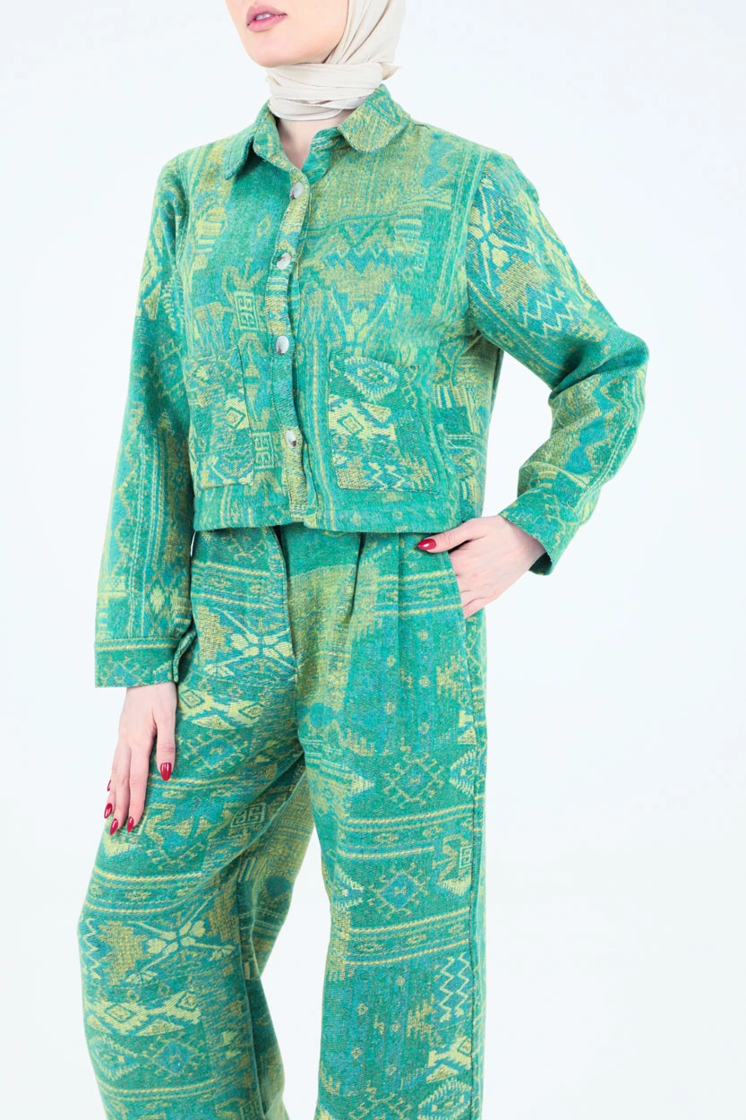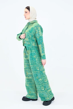 کت این ست در مدل کراپ طراحی شده؛ یعنی قد آن تا روی کمر است و ظاهری جوان، چشمگیر و امروزی ایجاد میکند. یقه برگردان آن جلوهای رسمی و کلاسیک به کت داده و در ترکیب با طرح پارچه کاملاً هماهنگ است. این نوع طراحی برای خانمهایی که استایل خاص و متفاوت میپسندند، انتخابی فوقالعاده است. همچنین کت کراپ به دلیل فرم جذابی که ایجاد میکند، بهخوبی با تیپهای رسمی و نیمهرسمی هماهنگ میشود.