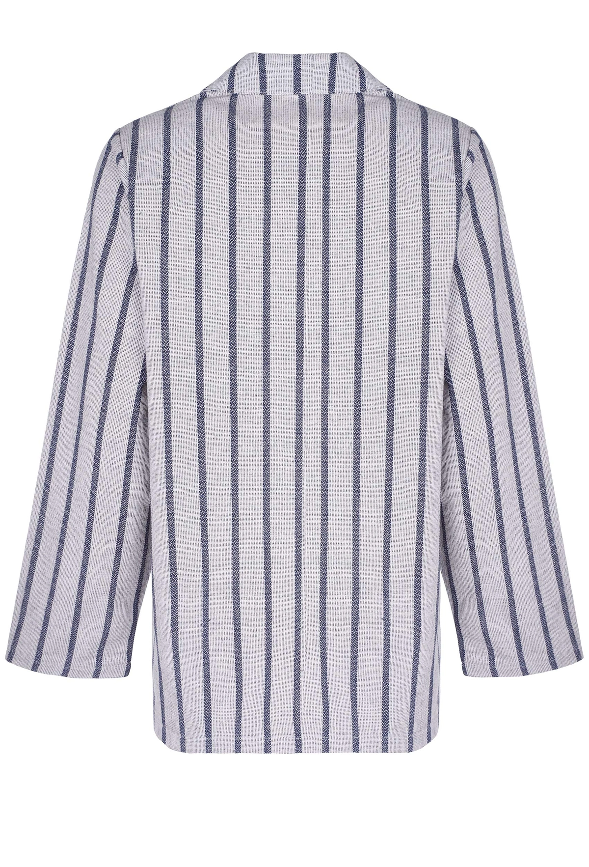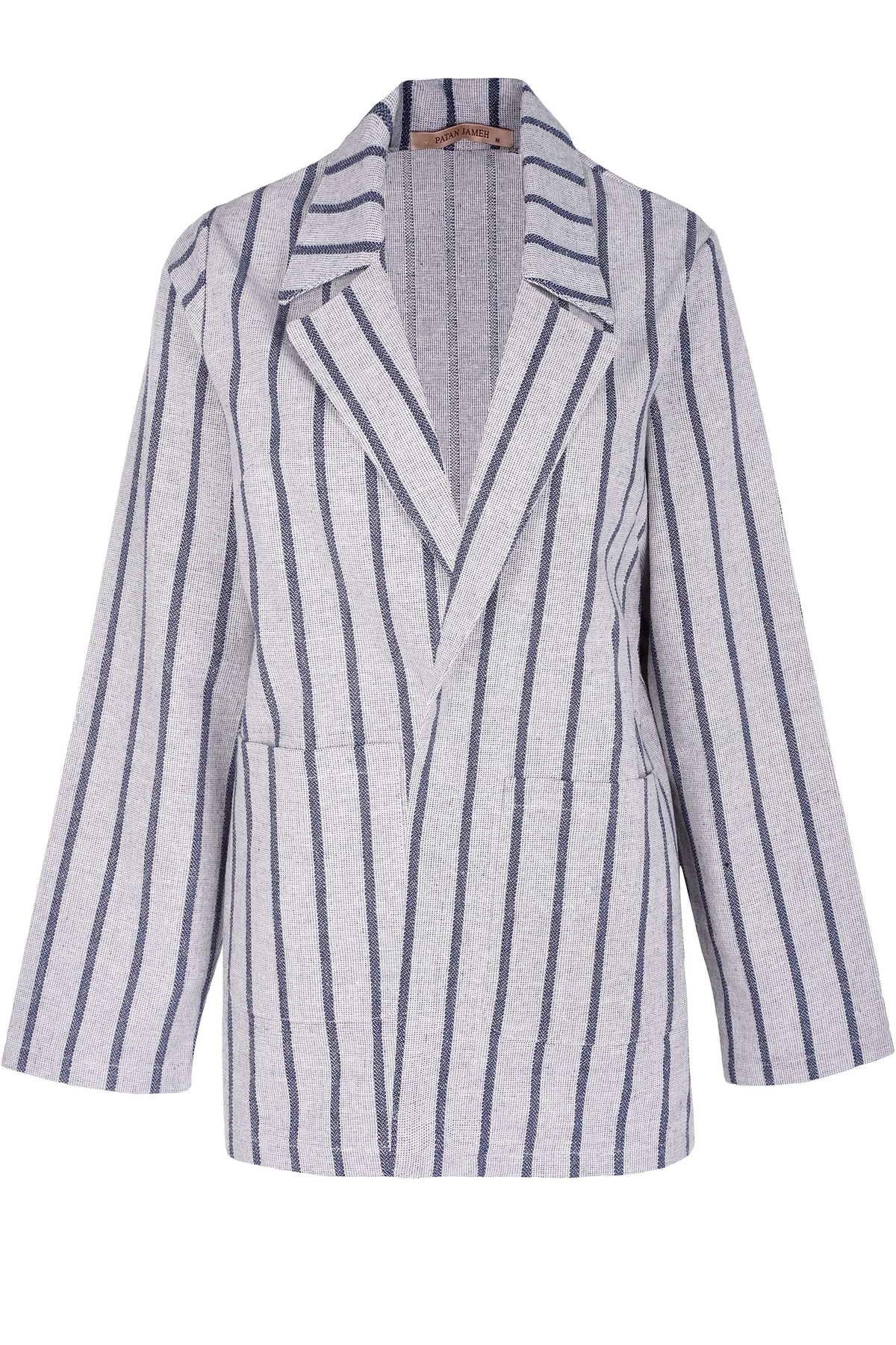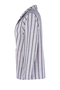 کت زنانه یقه انگلیسی ، از جنس صد در صد پنبه دارای دوجیب جانبی می باشد ، استایل نیمه آزاد جلو باز می باشد. کت با پارچه طرح دار از جنس کتان بوده ، ضخامت متوسط مناسب استفاده در فصل بهار و پاییز است.