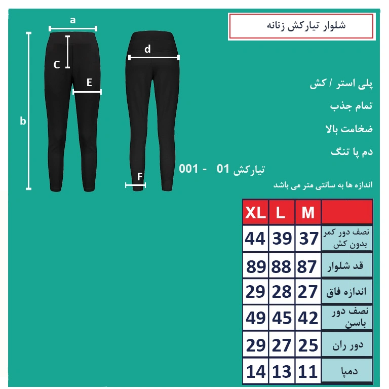 شلوار تیارکش زنانه تولید پاتن جامه می باشد. جنس پلی استر فول کش می باشد. شلوار تمام کشی جذب با ضخامت بالا می باشد. شلوار (لگ) جذب تیارکش قد تا روی مچ می باشد.