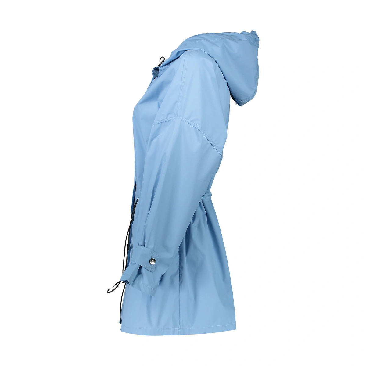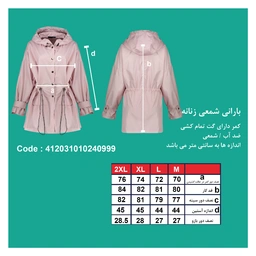 بارانی زنانه آبی تولید پاتن جامه می باشد. بارانی از جنس شمعی صد در صد پلی استر ضد آب می باشد. بارانی رنگ صورتی کمر کشدار کلاهدار.