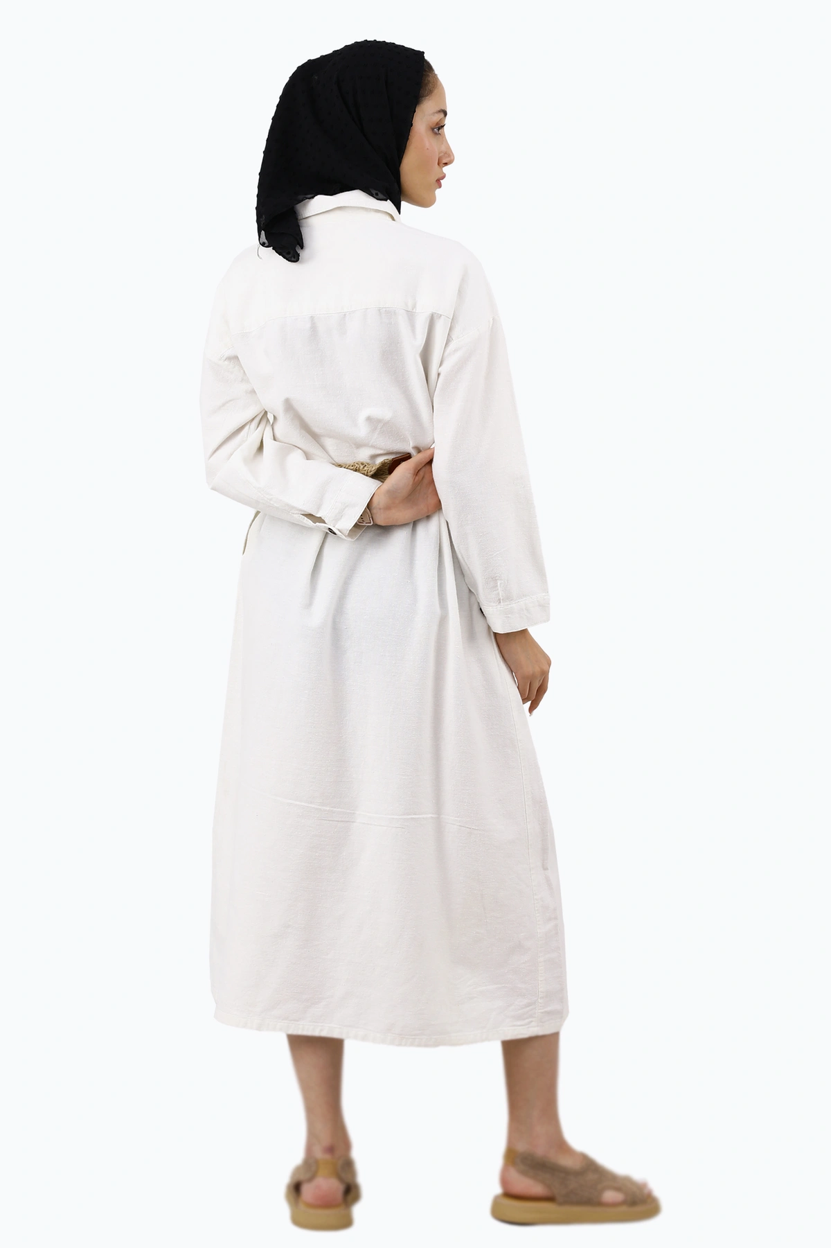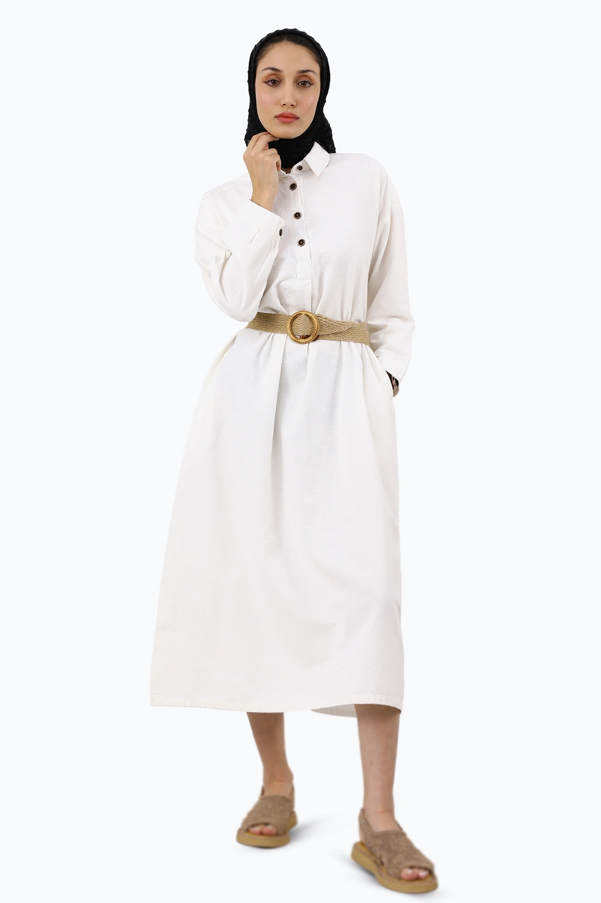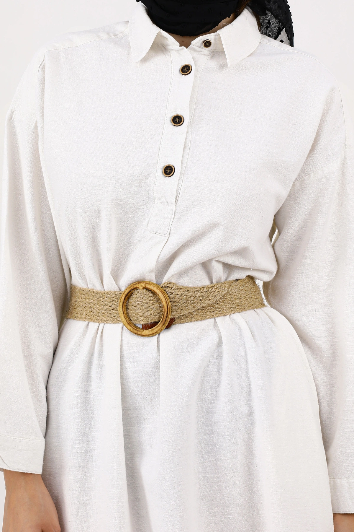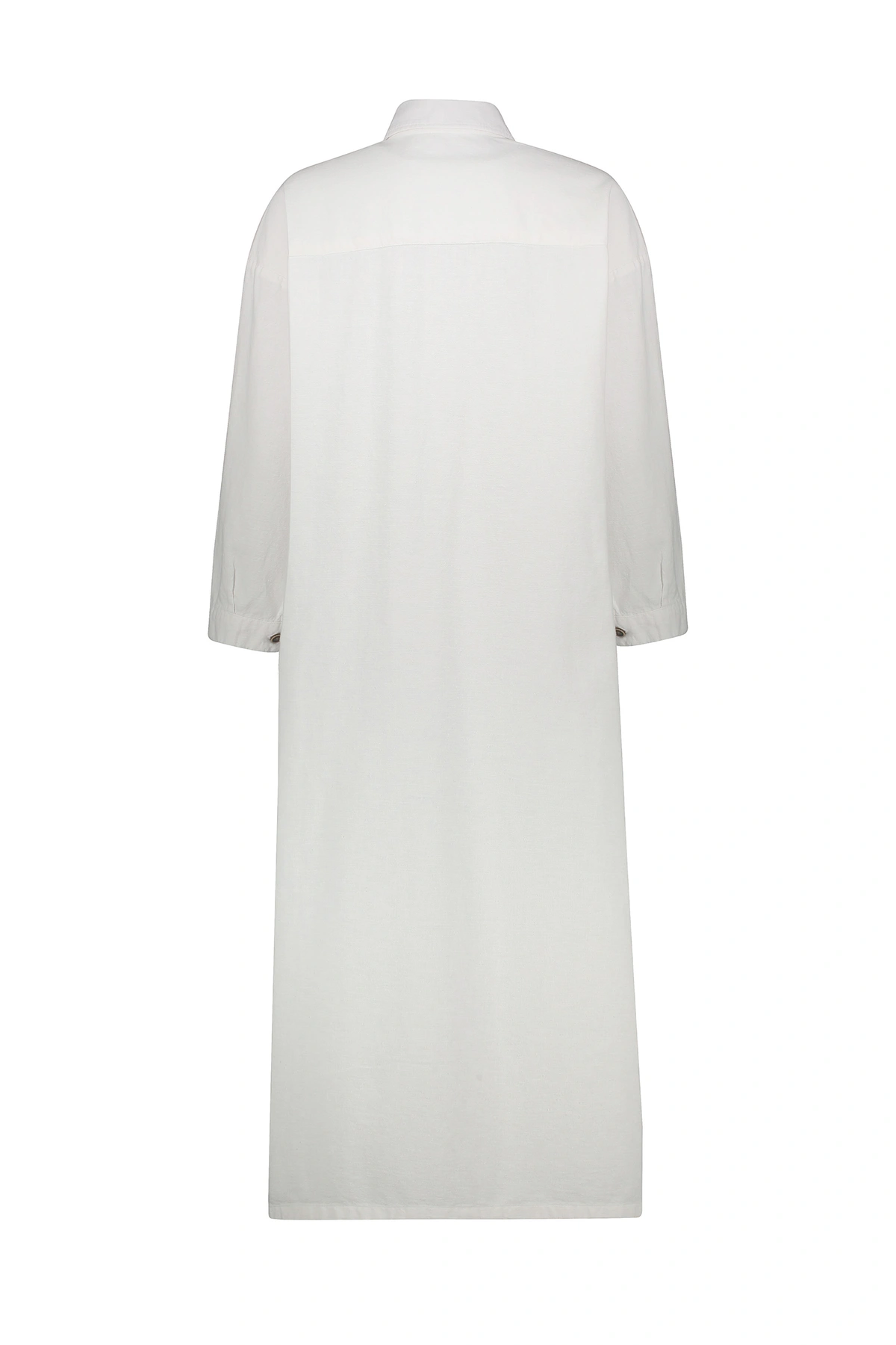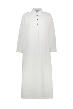 خرید پیراهن بلند زنانه ، صد در صد پنبه ای کتان ، استایل آزاد، پیراهن یقه برگردان آستین سه ربع می باشد. یقه دکمه دار ، دارای 4 دکمه روی پیراهن. خنک زیر دست لطیف رنگ سفید.