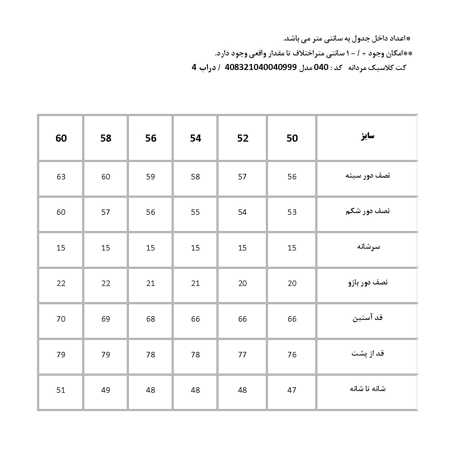 مشخصات فنی کت تک فاستونی مردانه مدل کلاسیک