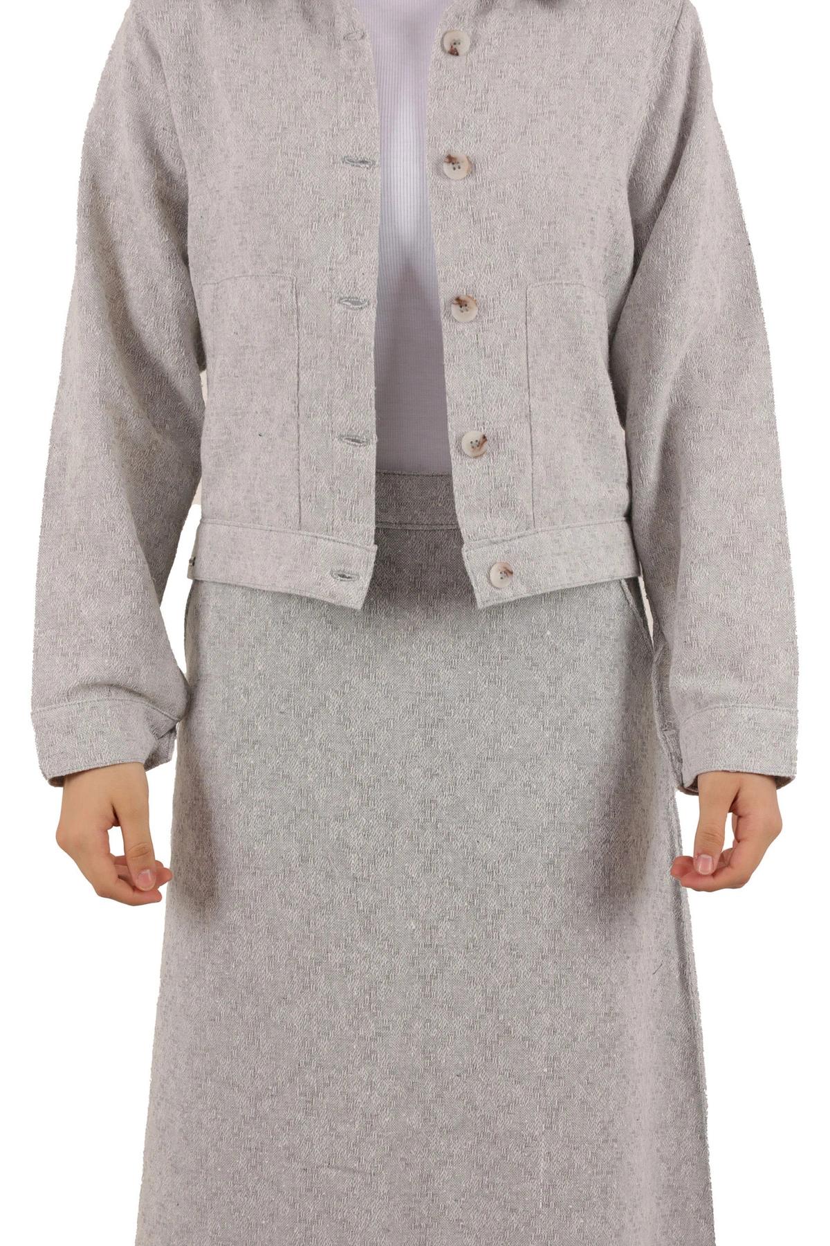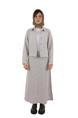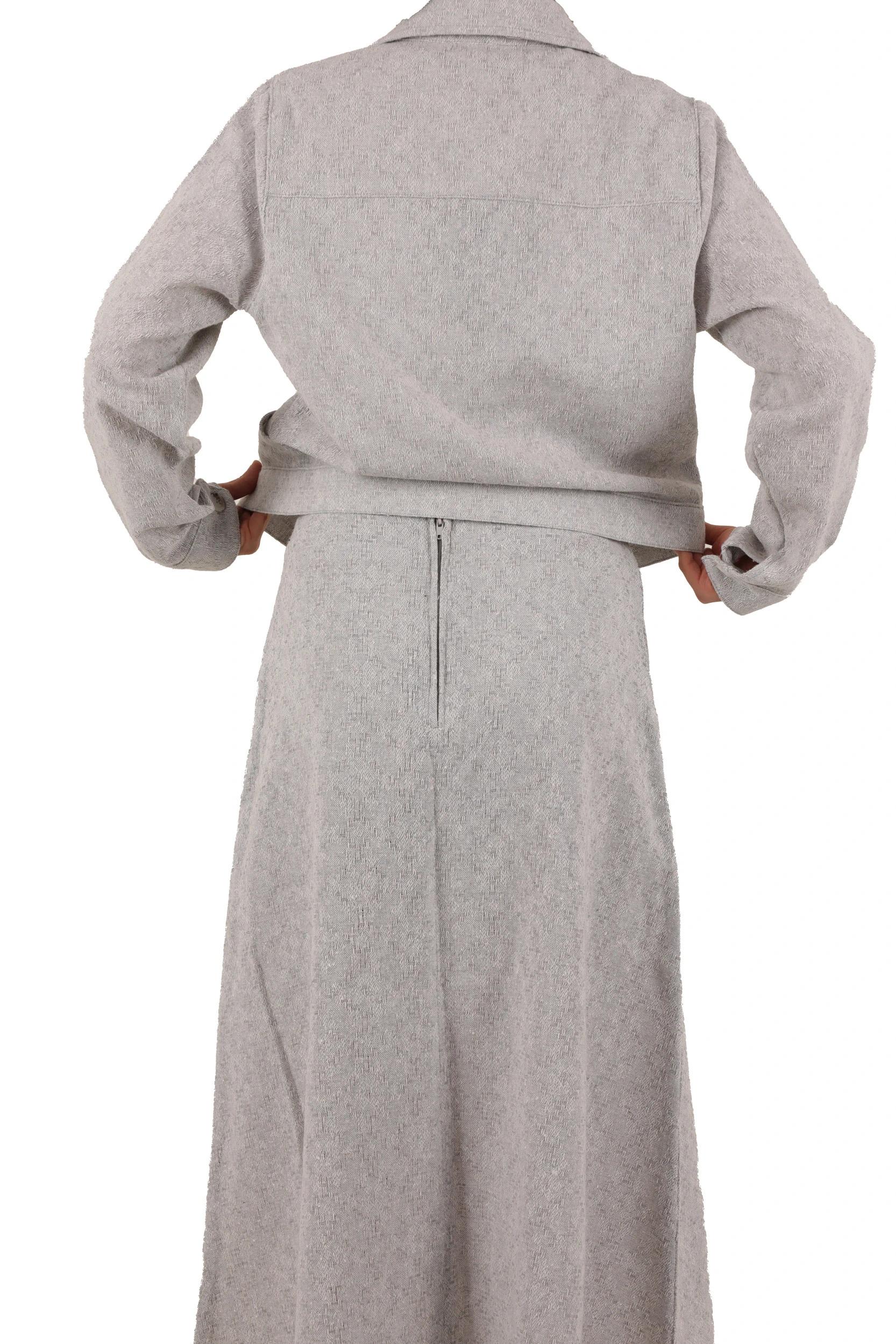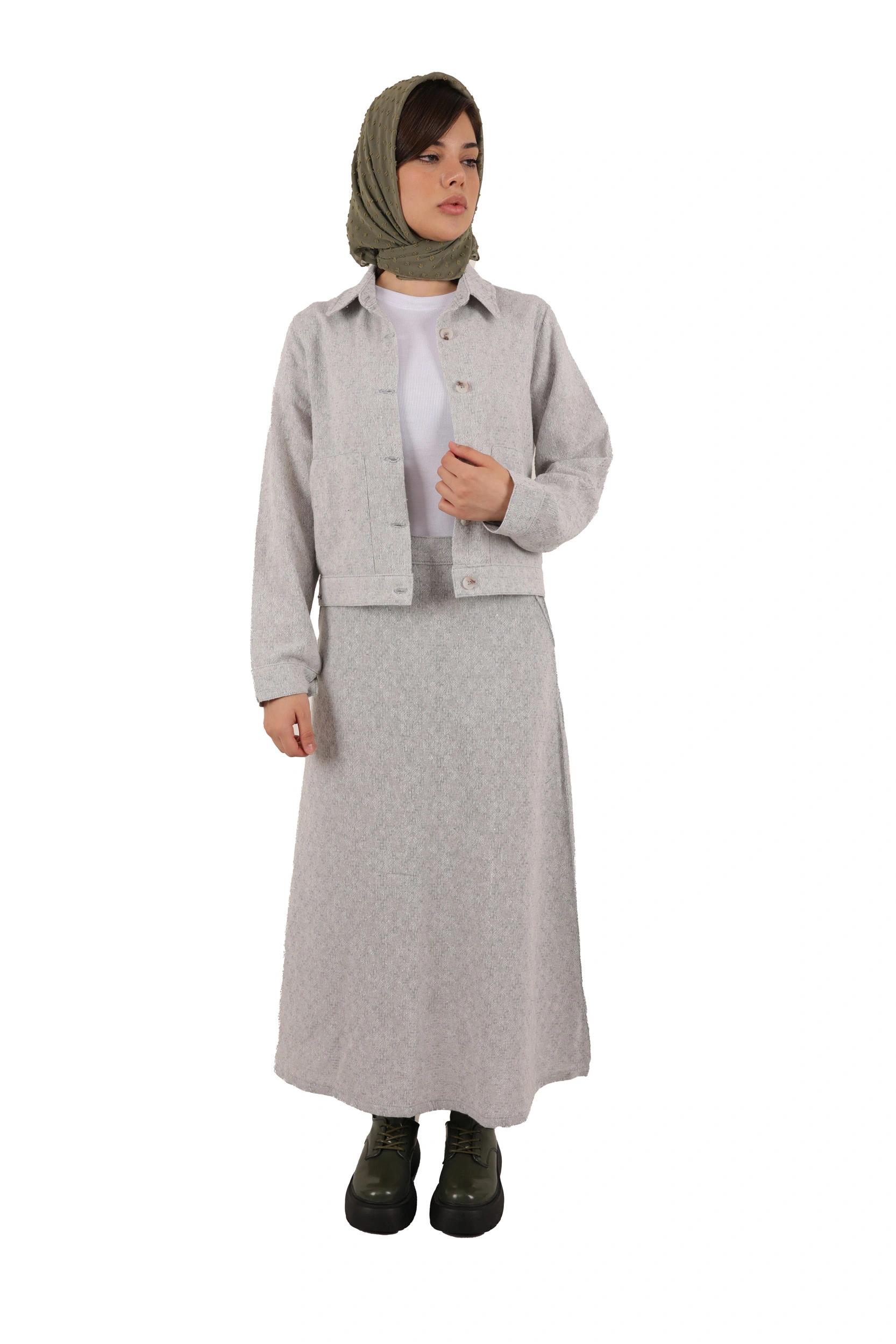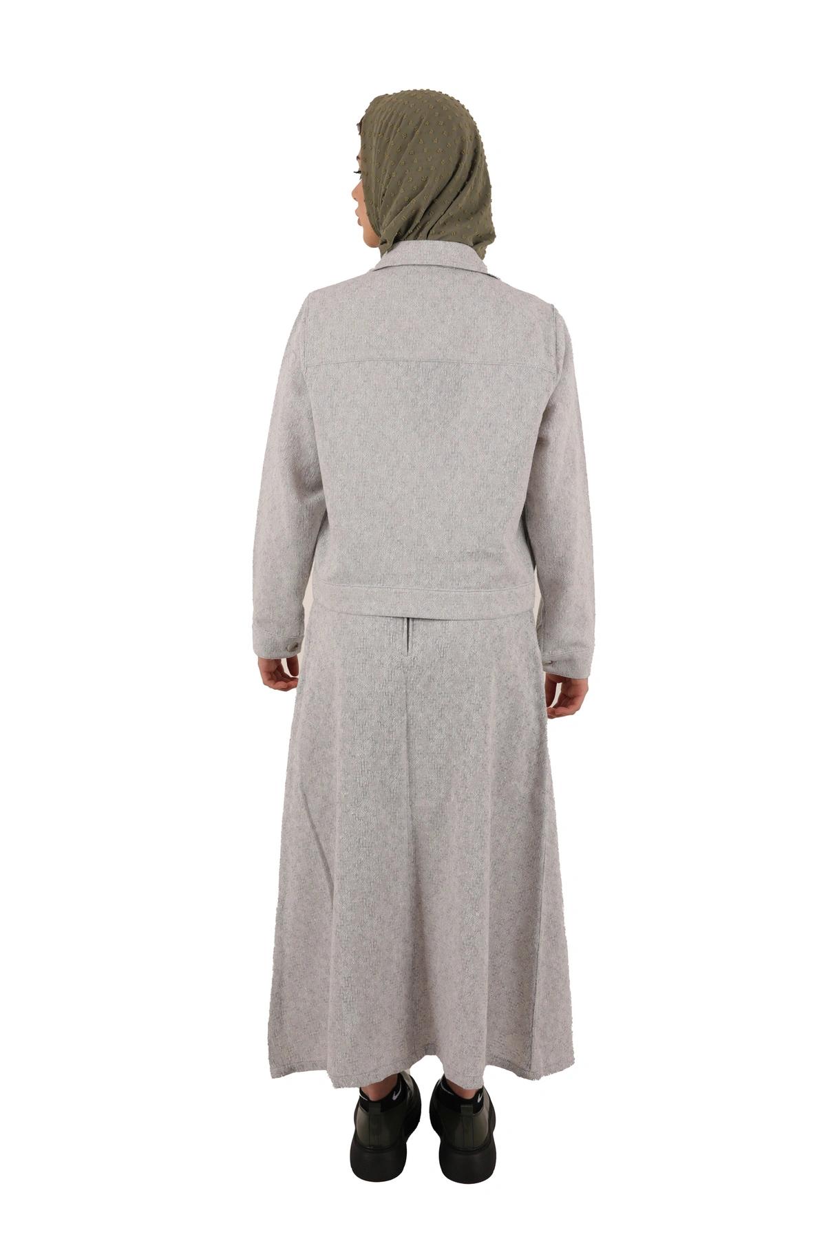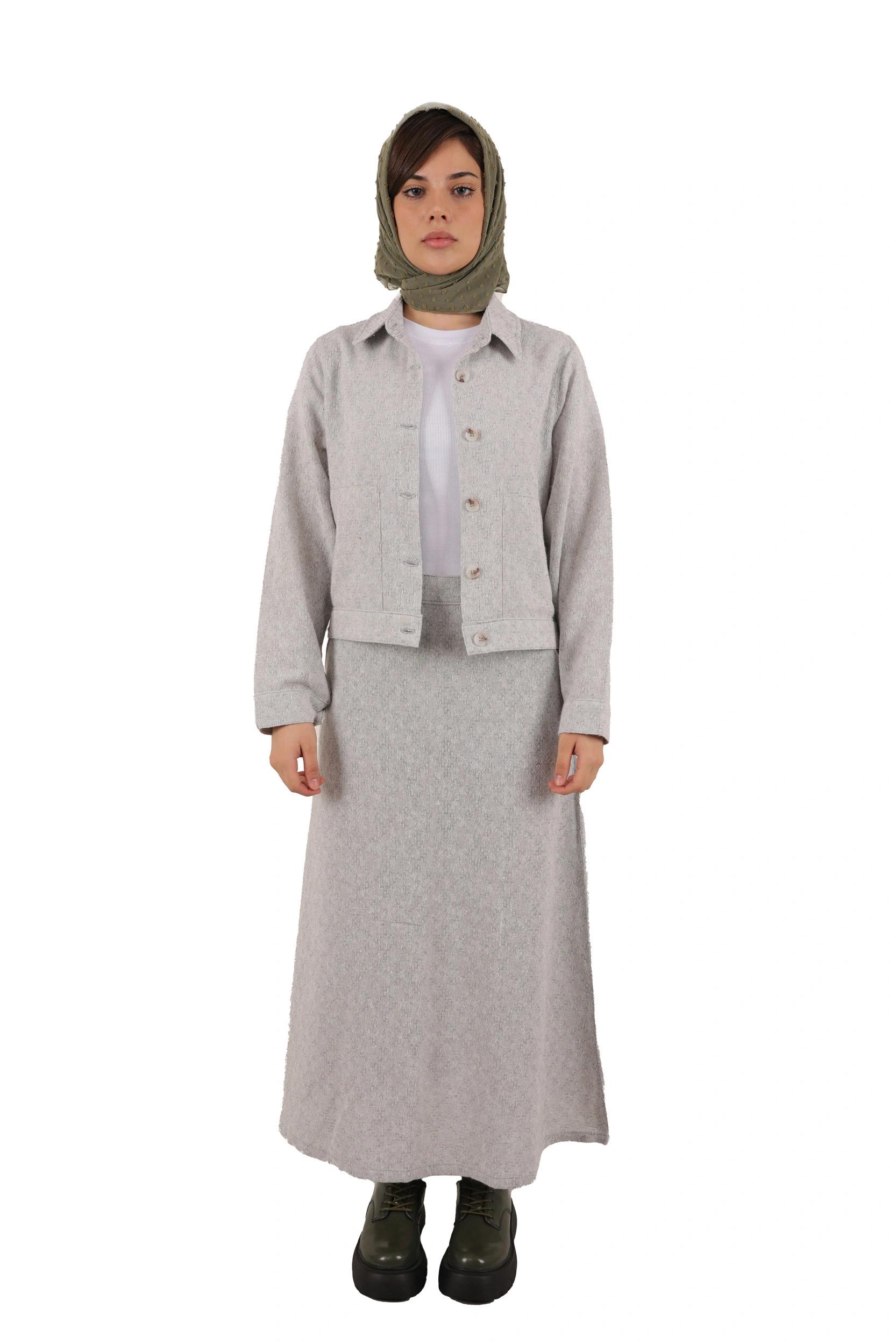 دامن این ست دارای دکمه و زیپ در قسمت پشت است، که باعث راحتتر پوشیدن و درآوردن دامن شده و در عین حال طراحی آن را مرتب و ظریف نگه میدارد.